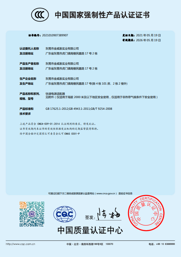 金威澎20W 1A1C快充充电器于2021年5月19日获得CCC认证,证书有限期至2026年5月19日。