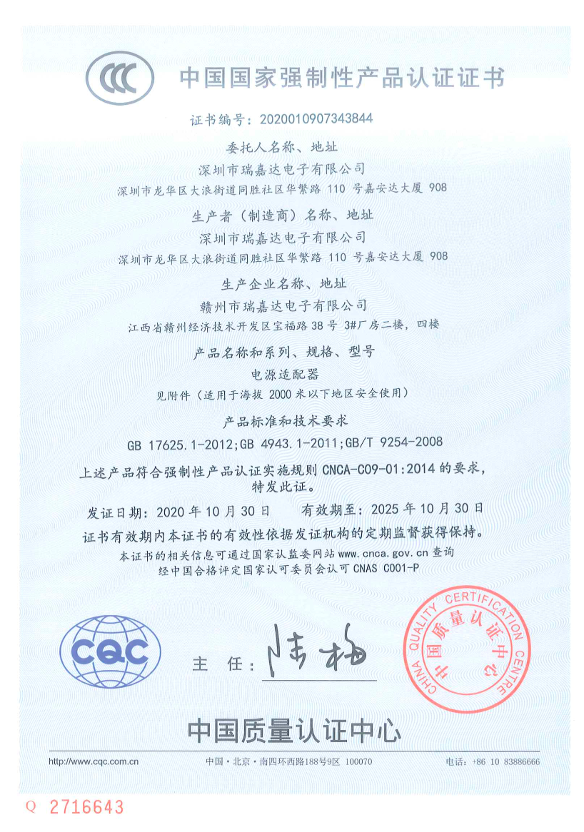 瑞嘉达20W 1A1C快充充电器于2020年10月30日获得CCC认证,证书有限期至2025年10月30日。