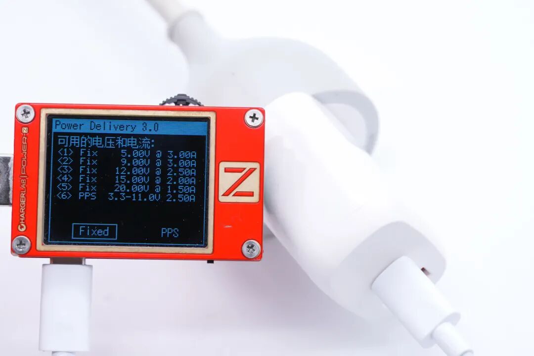 使用POWER-Z KT002 USB测试仪读取PDO报文,充电器基于PD3.0快速充电标准制作,支持5V3A / 9V3A / 12V2.5A / 15V2A / 20V1.5A三个固定电压输出,另外还带有3.3-11V2.5A一组PPS电压子集。