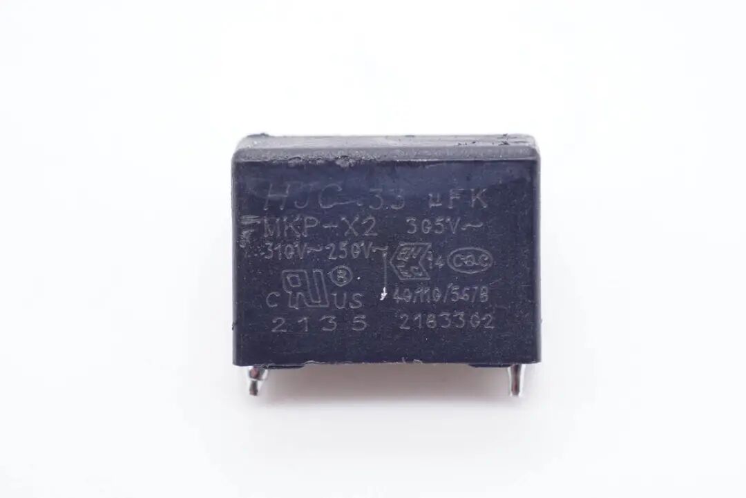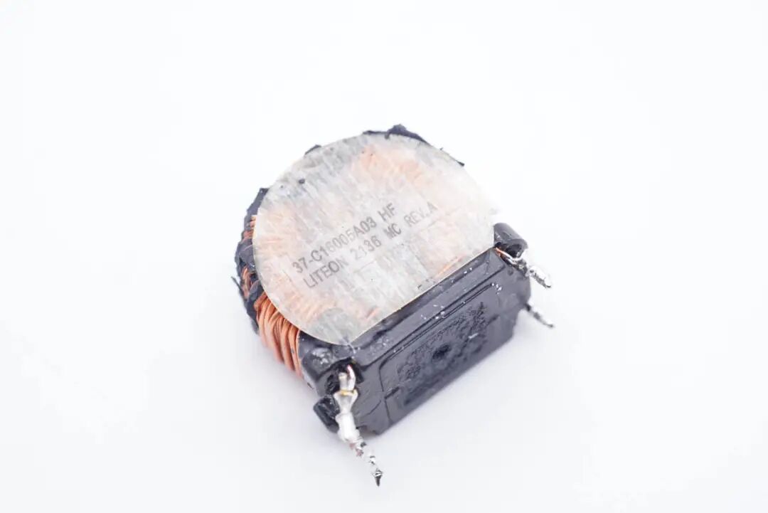 输入端保险丝套有热缩管,下面塑料外壳里面是一颗共模电感,此外还设有一颗大号的共模电感线圈和一个安规X电容。