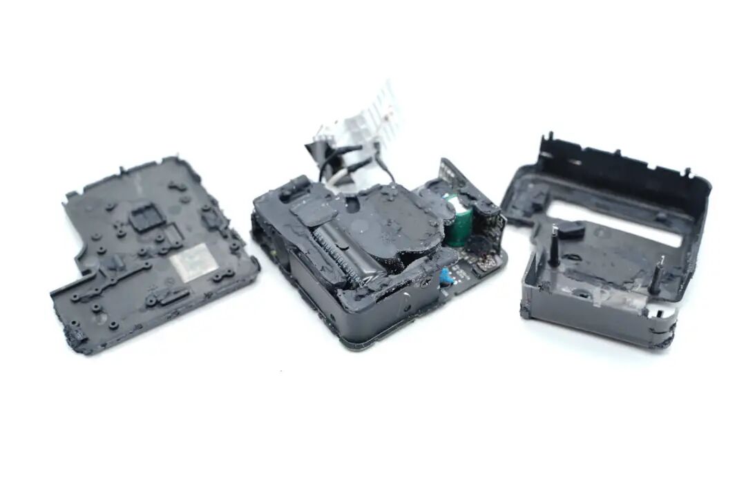 沿着充电器外壳中缝切开,掏出内部电源模块。打开外壳可见内部模块周身包裹了散热铜片,壳体内部居中均有一个环形胶带。同时在电源模块和外壳之间都采用注胶处理,起到固定的作用。