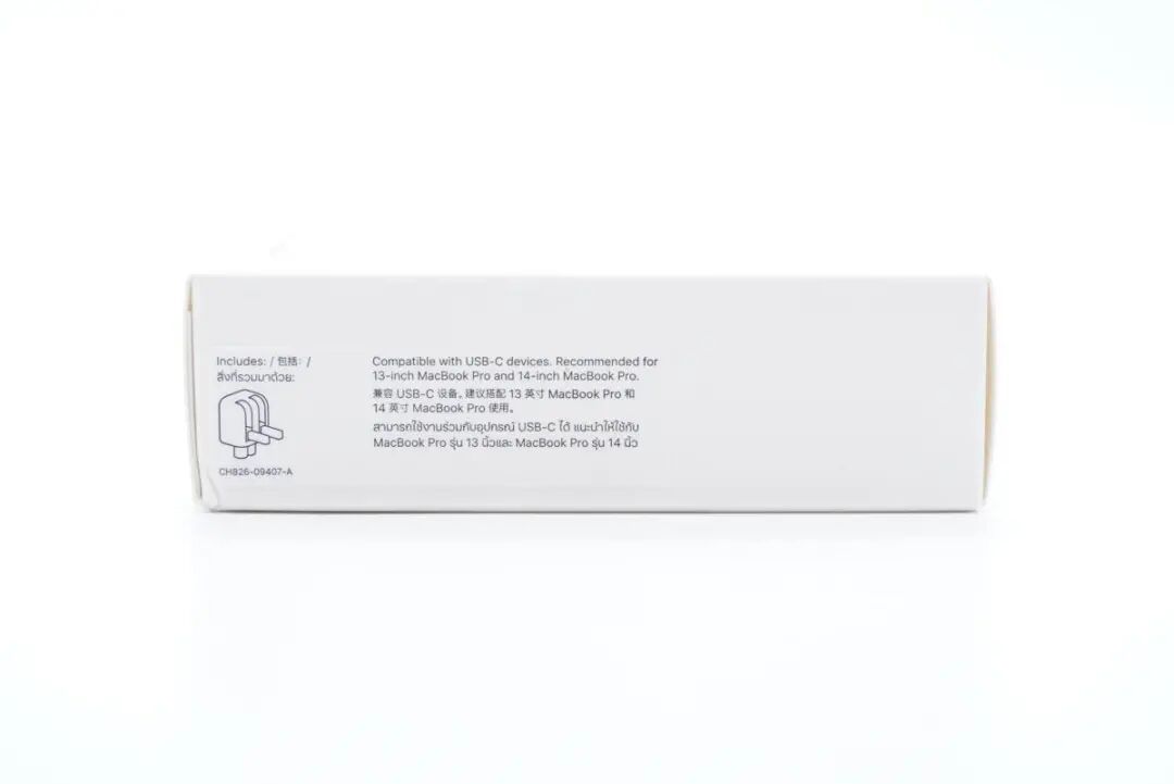 包装内附带电源插头,侧面建议:搭配13英寸和14英寸的MacBook Pro使用。