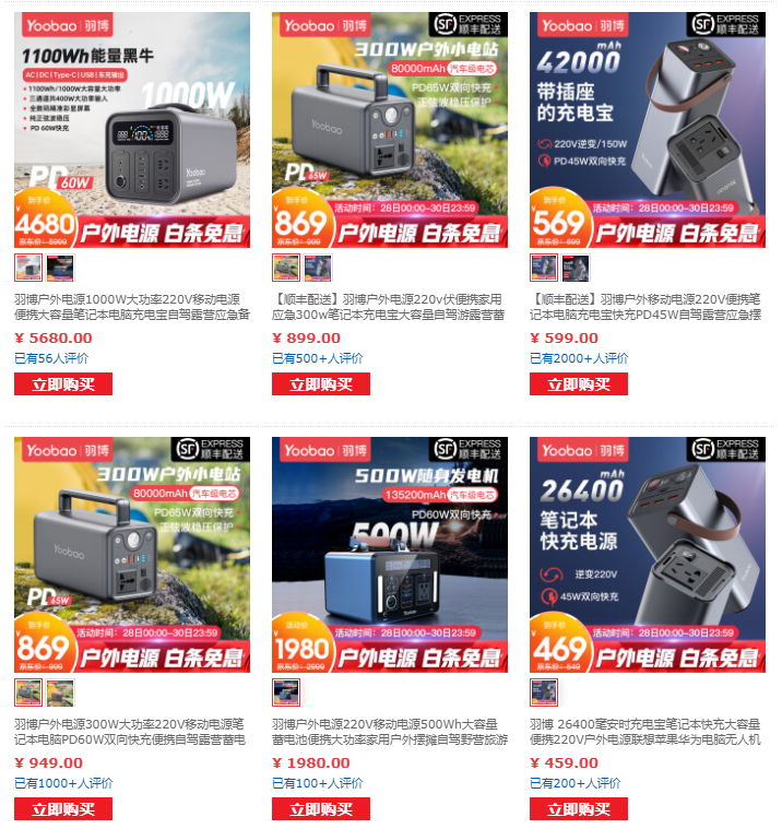 目前羽博京东旗舰店已也上架多款容量各异的户外电源产品,从26400mAh小容量产品至1100Wh大容量产品均有覆盖。