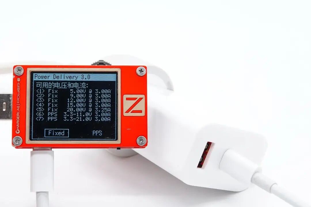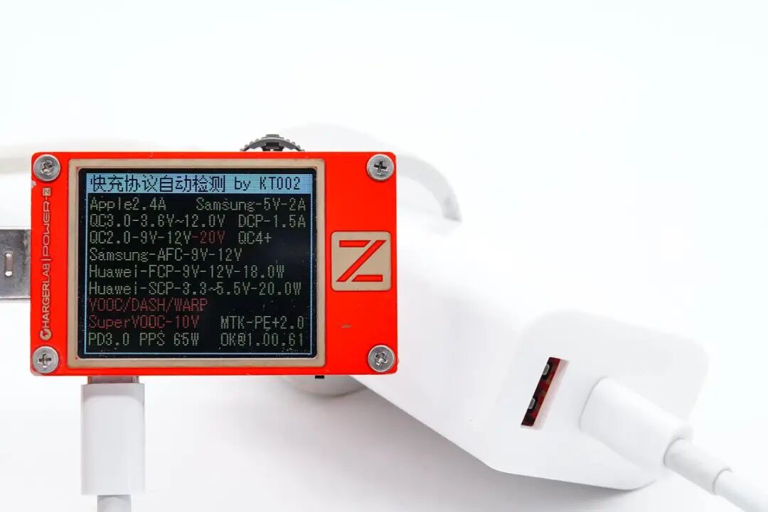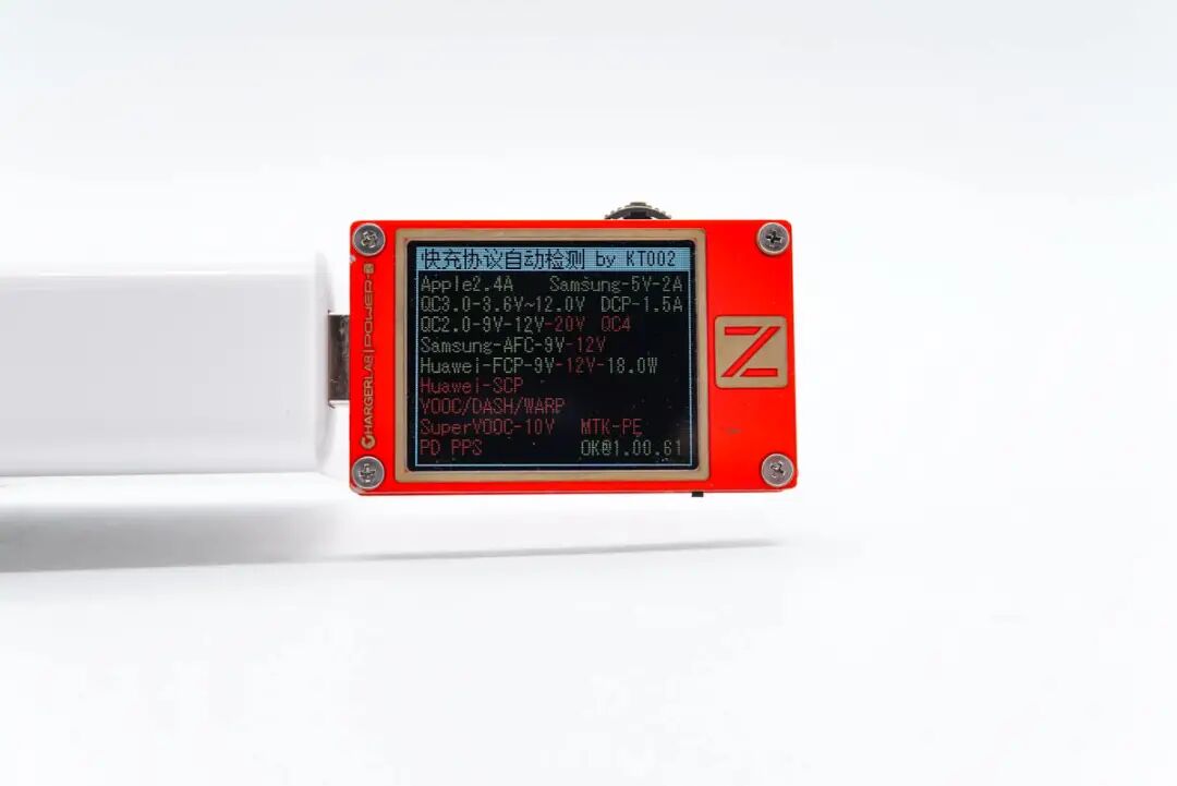协议方面,使用 ChargerLAB 的 POWER-Z KT002 读取充电器的快充协议,实测支持 Apple2.4A、QC2.0、QC3.0、QC4+、AFC、FCP、SCP、PE、PD3.0和PPS等充电协议。