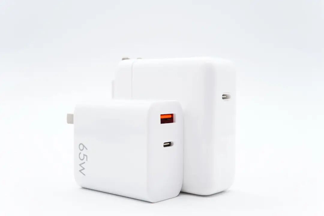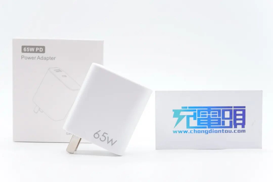 充电器通体白色,正面右下角印有65W的字样。
