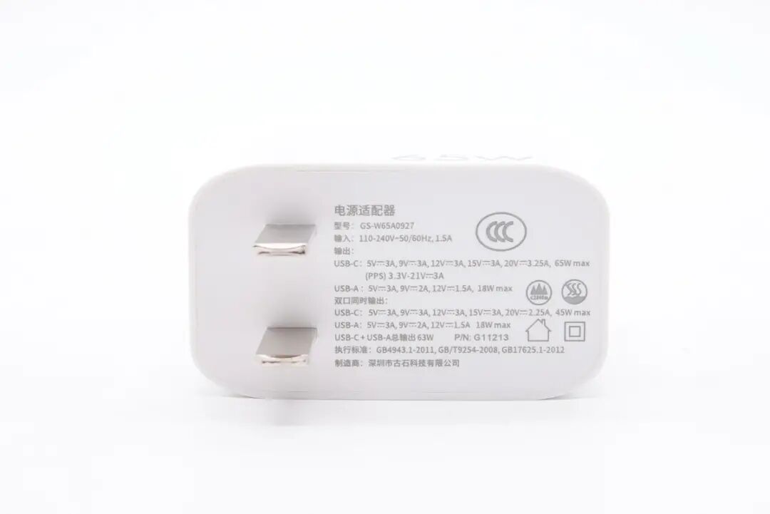 底部丝印有产品参数,型号为 GS-W65A0927,支持宽频电压输入,USB-C 接口最大输出65W,USB-A 接口最大输出18W,双口同时输出最大功率63W。