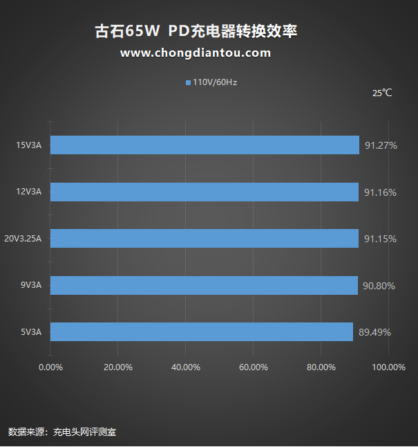 110V 60Hz下,充电器的转换效率从89.49%到91.27%不等。
