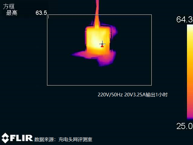 充电器背面最高温度为63.5°C。