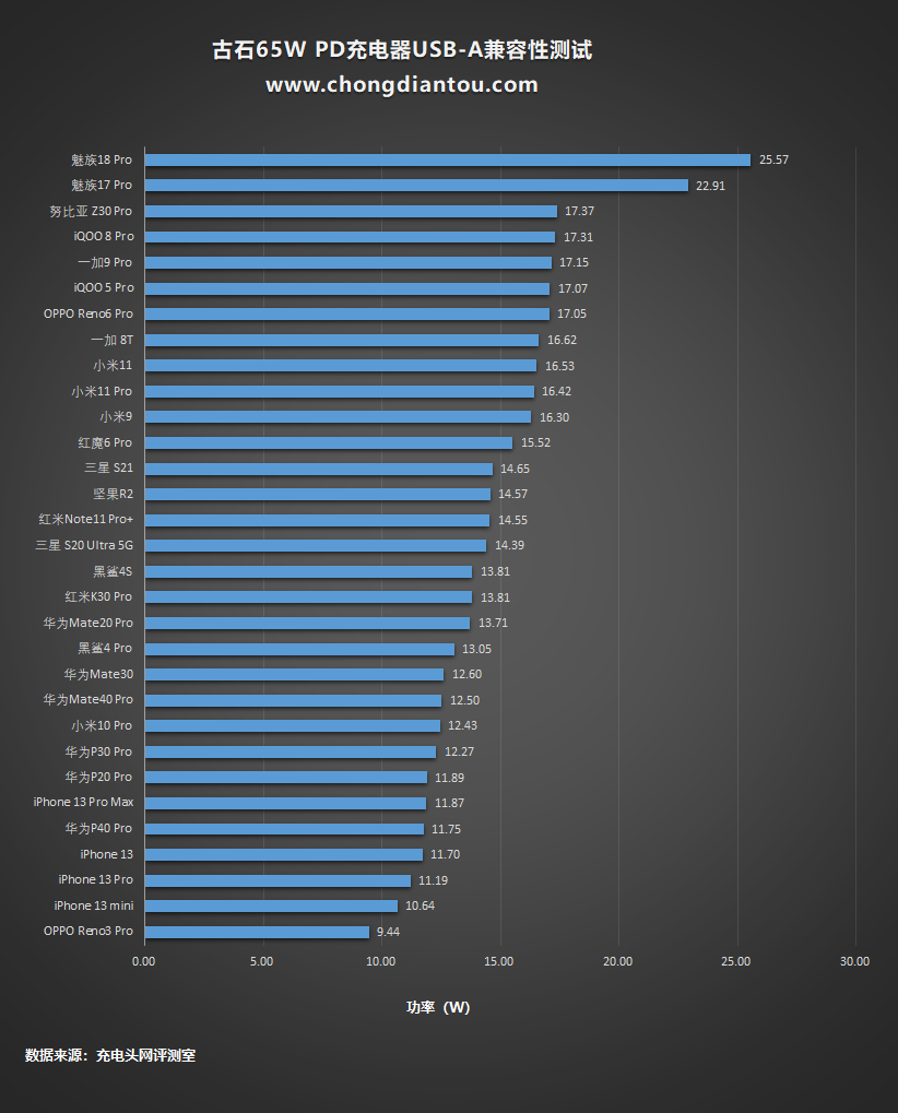 将充电功率从高到低排列,魅族两款机型表现极佳。
