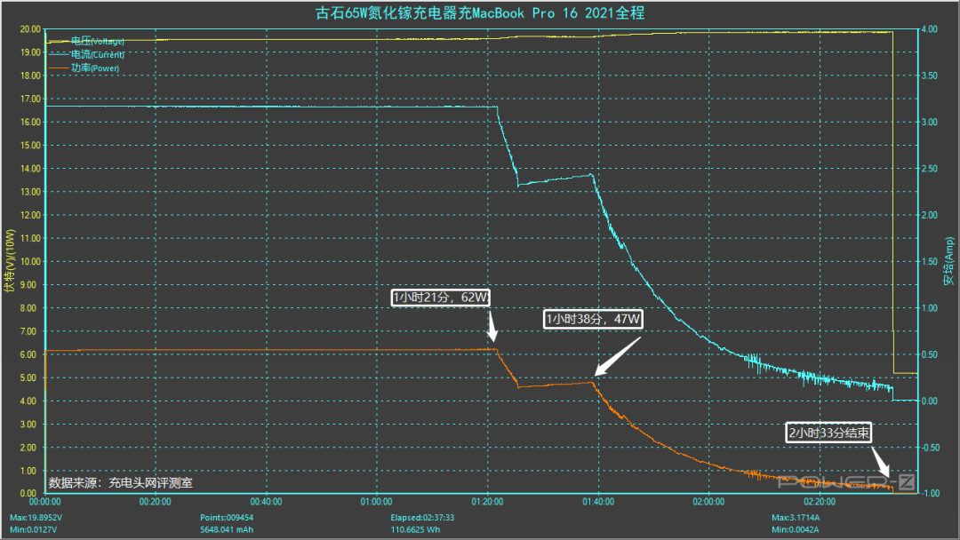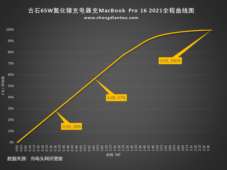 上图是使用古石65W氮化镓充电器为MacBook Pro 16 2021充电全程的变化图,整个过程大致分为三个阶段,于2小时33分充电结束。