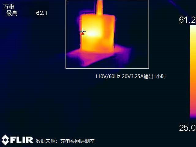 一小时后充电器正面最高温度62.1°C。