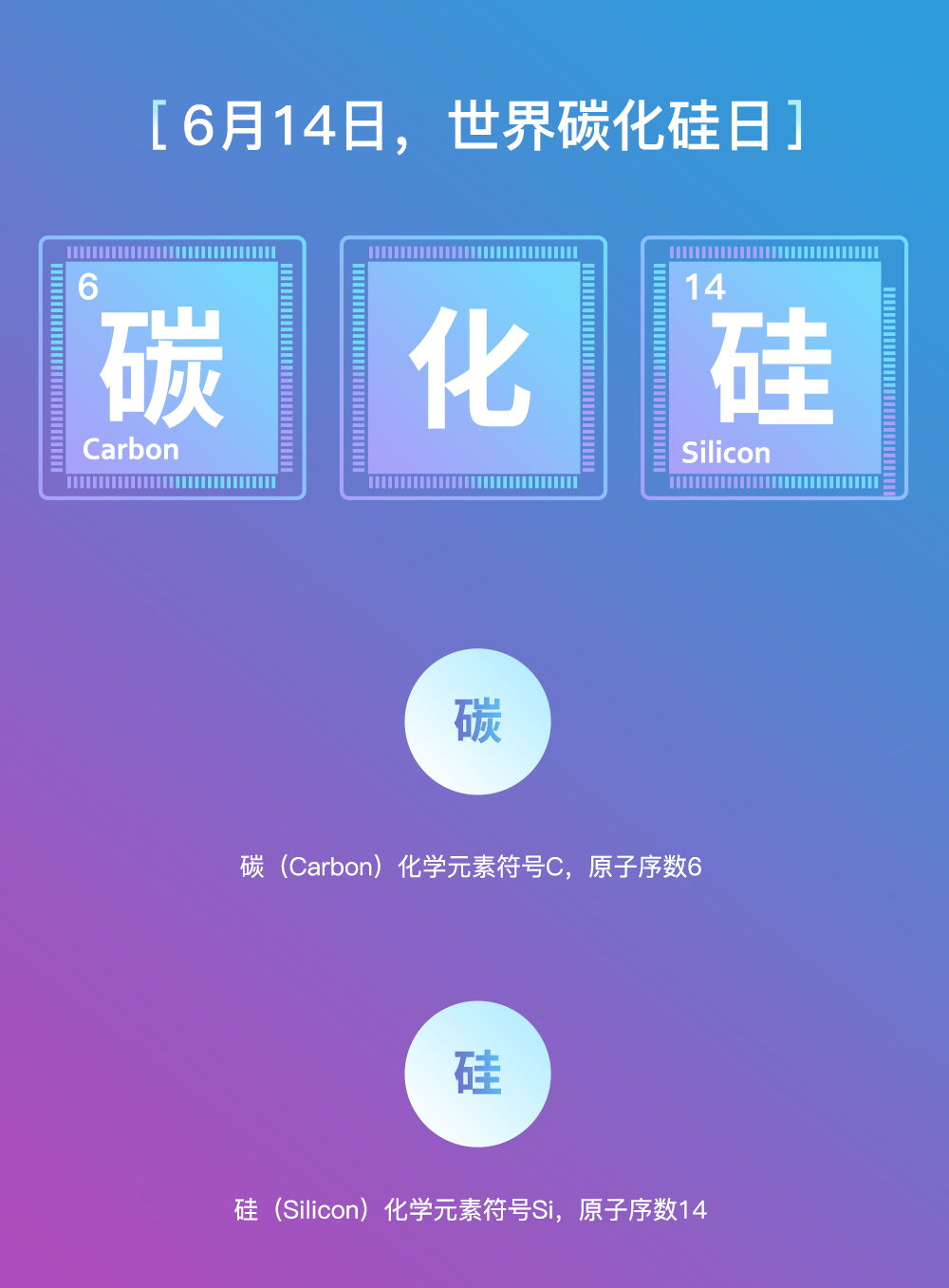 碳(Carbon)化学元素符号为C,原子序数6。硅(Silicon)化学元素符号为Si,原子序数14,因此将每年的6月14日定为世界碳化硅日。