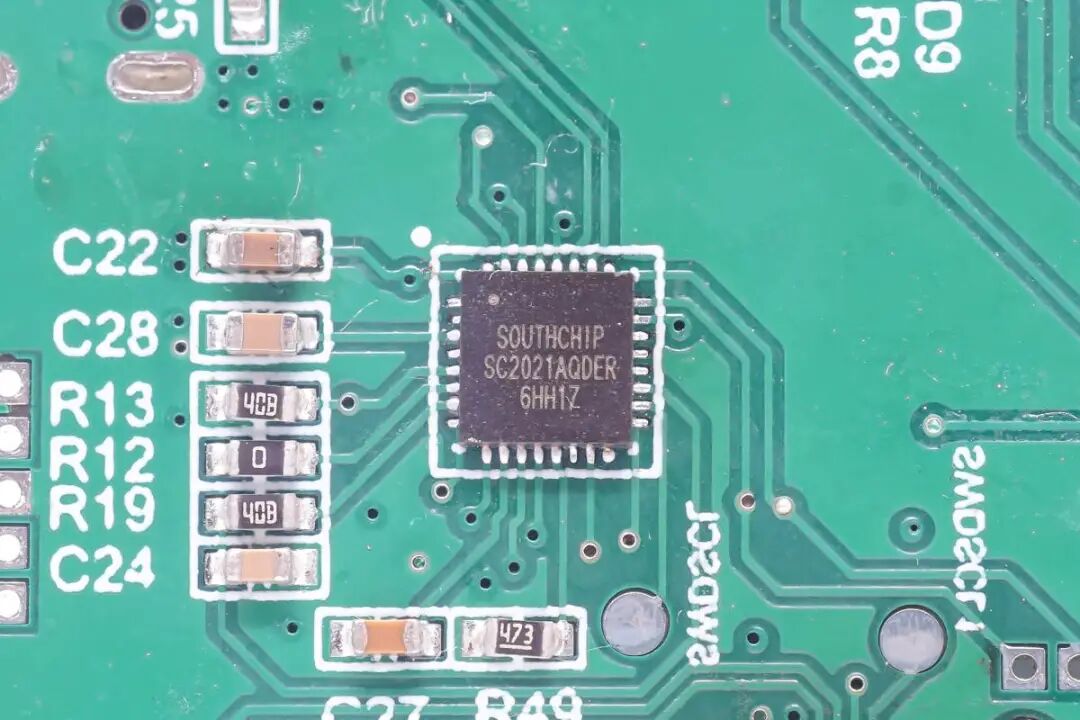由于这款参考设计是设计为双路独立输出,背面我们看到了两颗SC2021A协议芯片,实际上SC2021A可以满足单颗芯片实现1A1C双路独立快充输出的。