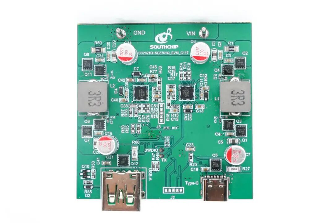 南芯SC2021A双口参考设计采用1A1C双接口,采用同步升降压电路,支持宽范围输入电压,满足12到24V电压输入,适配快充和车充应用。
