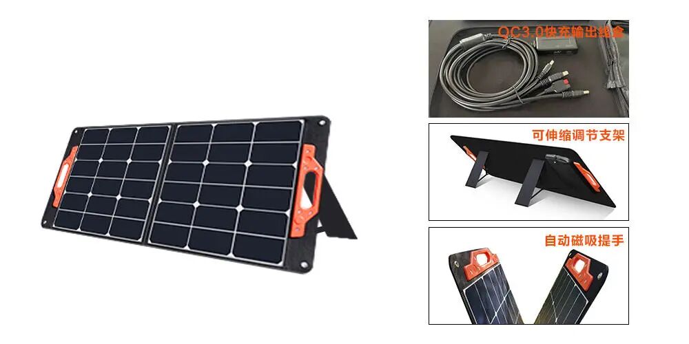 Glory solar-100w两折户外折叠太阳能充电板,采用美国进口SUNPOWER电池片,降低不良率损耗率,转化率高到24%。独家开模自动磁吸提手,外观精美,使用寿命比普通提手更长。表膜采用日本进口ETFE层压,比普通PET防刮防水,耐腐蚀抗阻燃,使用寿命更久。支持QC3.0快充协议,拥有USB/TYPE-C双输出接口,可直接给数码电子产品供电。
