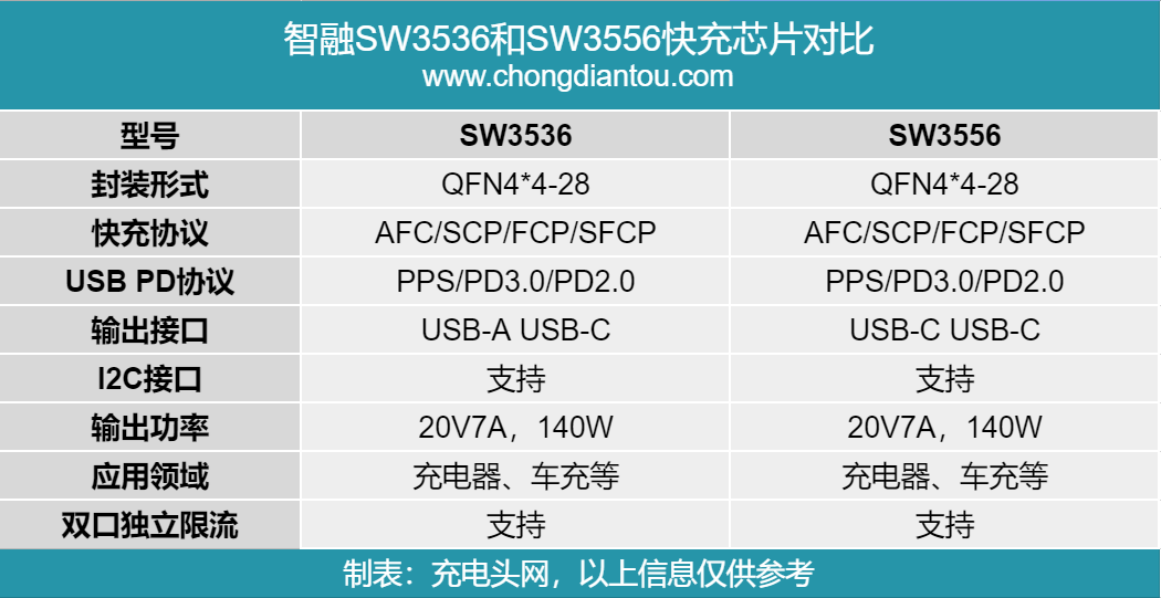 应对不断增长的大功率快充市场,智融推出了两款支持140W快充输出的协议芯片,分别是支持1A和1C接口的SW3536和支持2C接口的SW3556,两款芯片均支持私有快充协议,满足20V7A,140W输出功率。