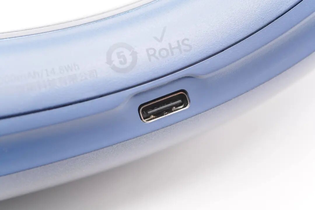 右边还有RoHS认证标识,产品采用USB-C接口充电,适配市面上的绝大多数充电器。