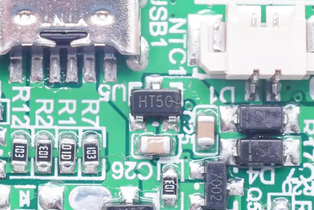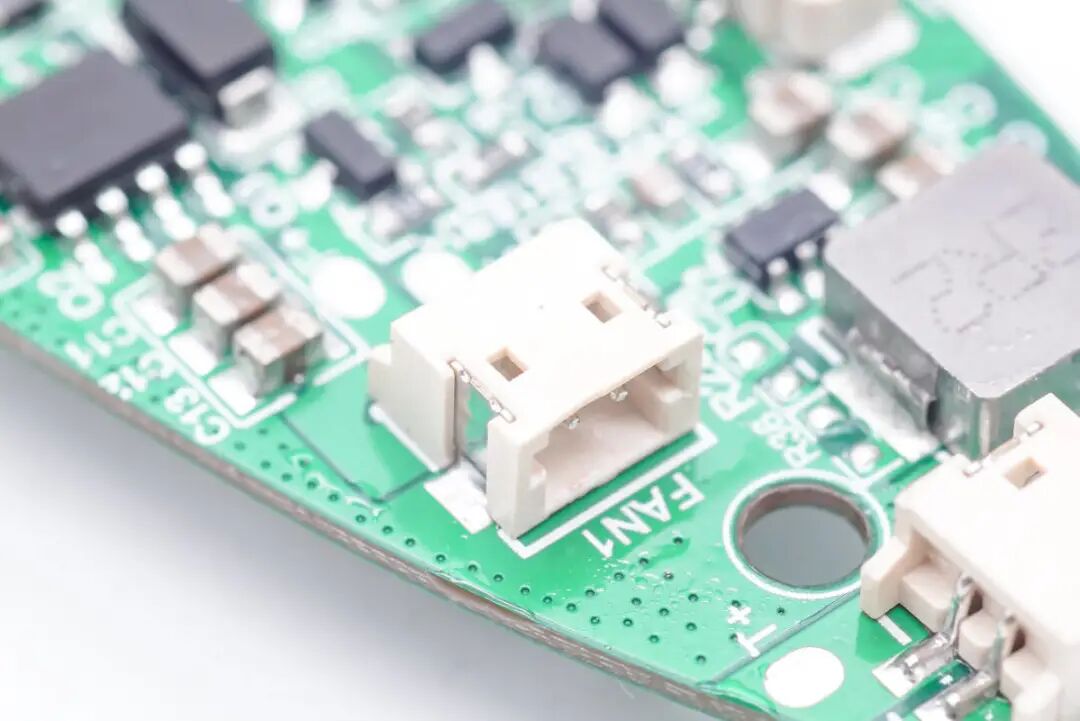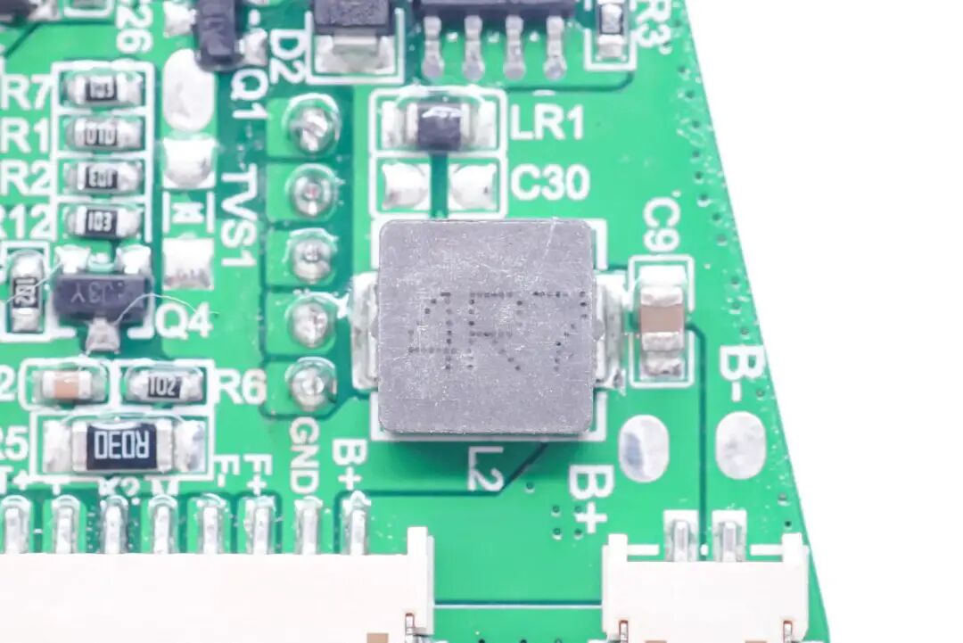控制板背面是两路电感,用于电池充放电和以及制冷制热控制。接线小板上面是连接电池,风扇,制冷片和NTC的插座。