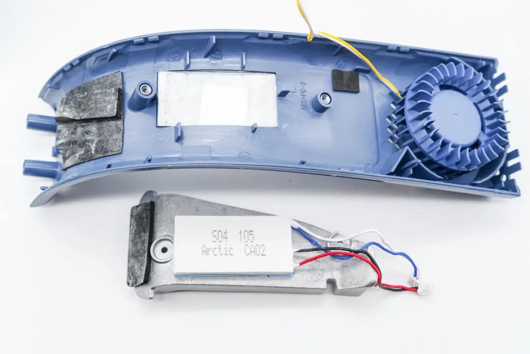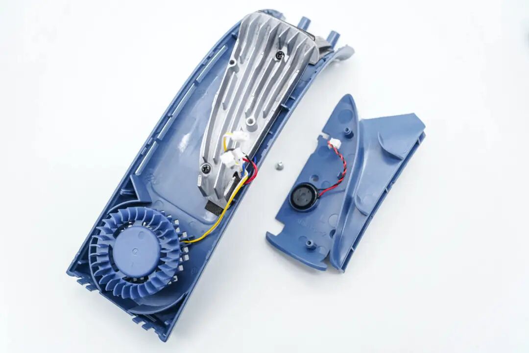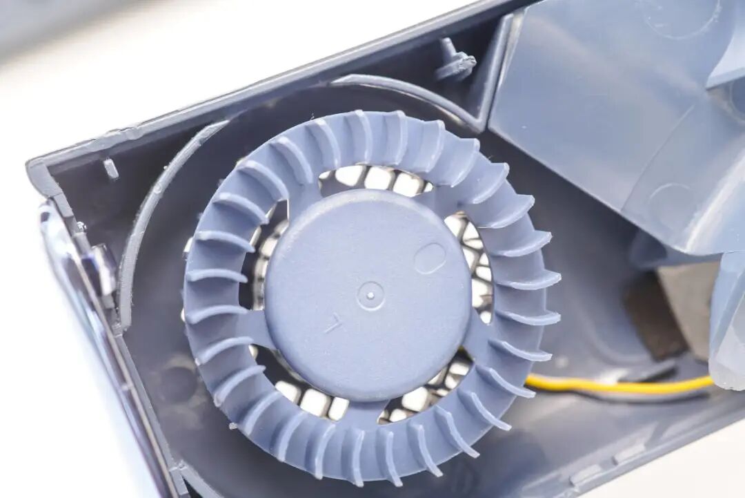 外壳内部导风板特写,下面为导风设计,将风扇吹出的气流引导到侧面吹出。