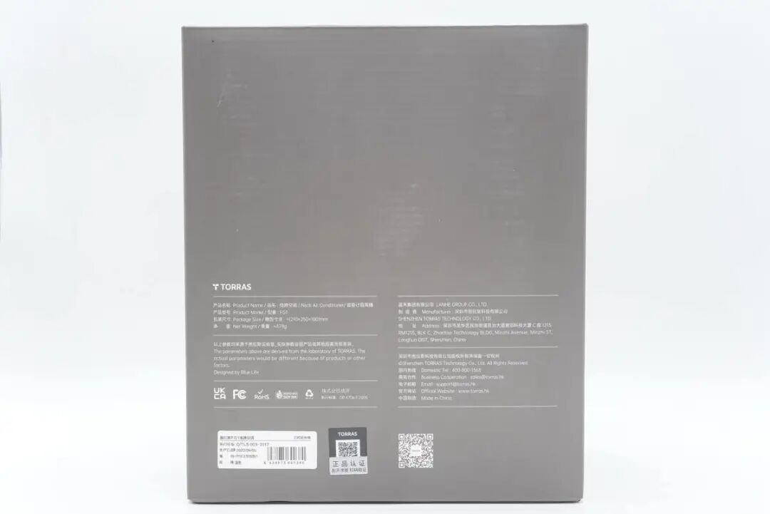 包装盒主体为灰色基调,正面印有TORRAS品牌、COOLIFY2以及名称——图拉斯 酷飞挂脖空调。
