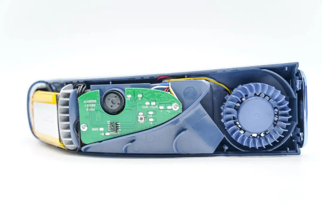 充电头网通过拆解了解到,图拉斯酷飞2挂脖空调内置4000mAh锂电池,支持长时间使用。产品具备凉风模式,热疗模式和空调模式,不同季节均可使用。空调内置两片TEC制冷片,并在制冷片内部集成NTC热敏电阻,精确检测温度,响应更快,控温高效精准。