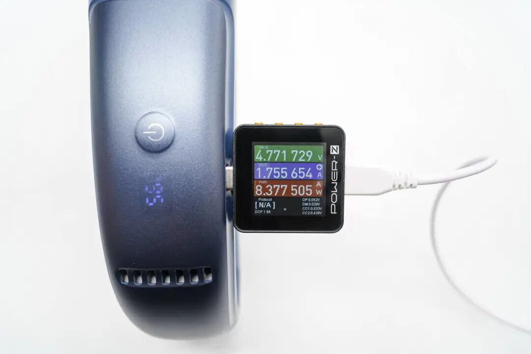 给图拉斯这款酷飞2挂脖空调充电,使用ChargerLAB POWER-Z KM002C测得输入功率为4.77V 1.76A 8.38W。