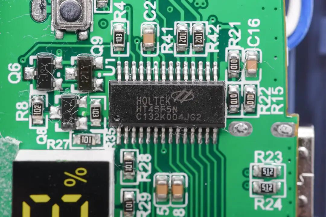 控制板采用一颗合泰HT45F5N专用单片机用于电池充电,电量显示以及制冷和制热控制。单片机内置充放电PWM控制,内置ADC,集成度高,功能全面。