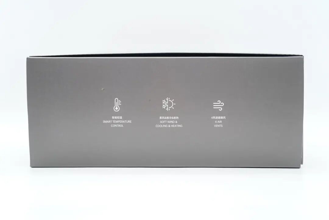 侧面是产品三大卖点:智能控温、柔风&制冷&制热、4风道健康风。