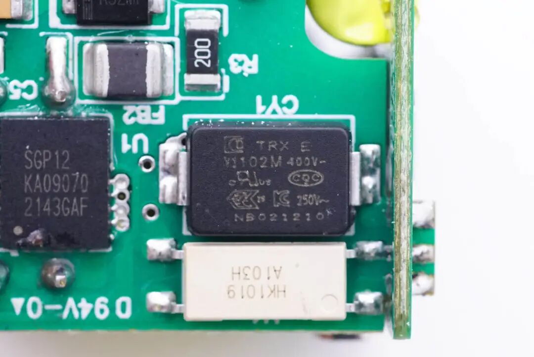 内部集成氮化镓开关管的主控芯片特写,丝印SGP12 KA09070,来自Elevation Semiconductor,是一家2021年成立的新公司,提供集成GaN的合封芯片。