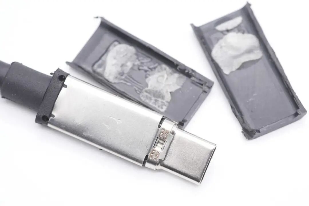 拆下USB-C公头的金属外壳,露出内部针脚。