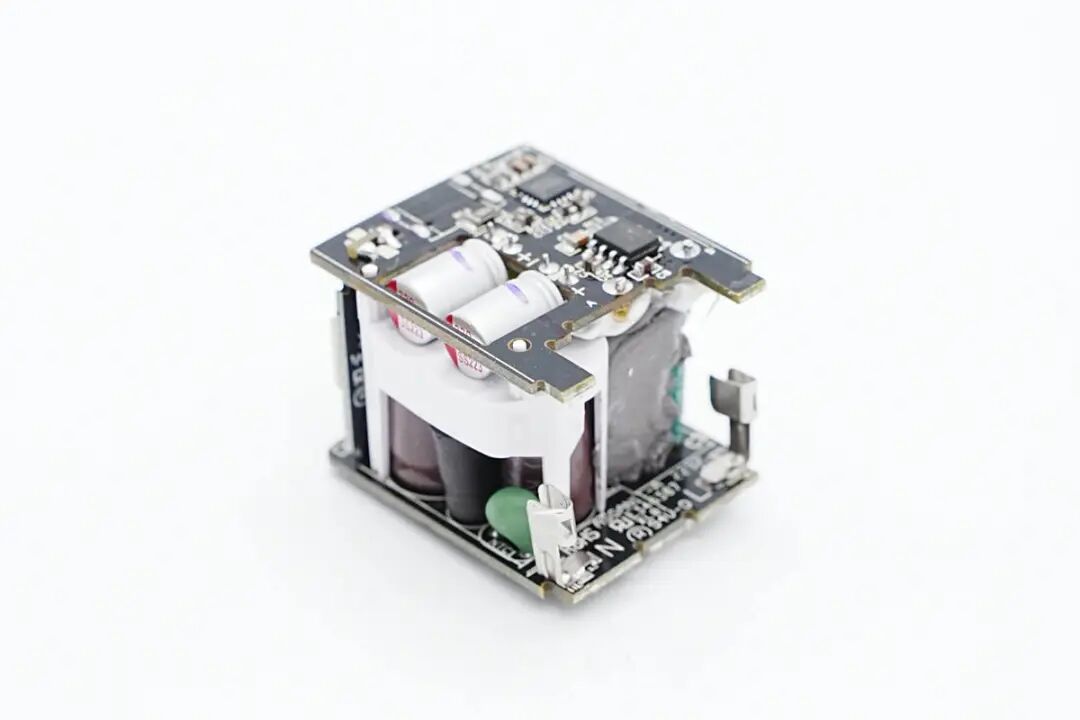 充电器内部PCBA模块由三块PCB焊接组成,底部高压小板焊接触点连接折叠插脚取电。