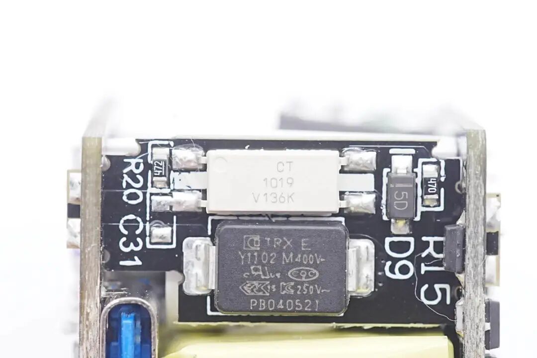 侧面焊接的小板连接初级与次级,小板上焊接光耦和贴片Y电容。