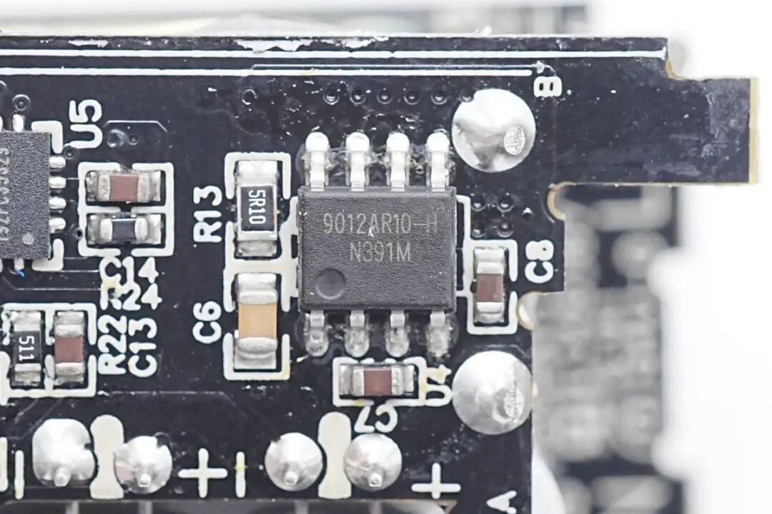 在芯片下方左侧是一颗热敏电阻,用于检测充电器内部温度,进行过热保护。