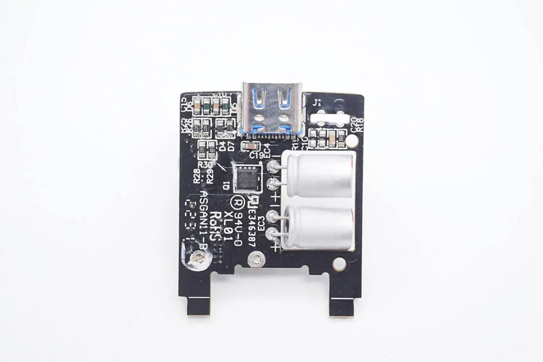 在底部的小板上焊接同步整流芯片和协议芯片。小板右侧镂空焊接滤波电容,降低厚度。