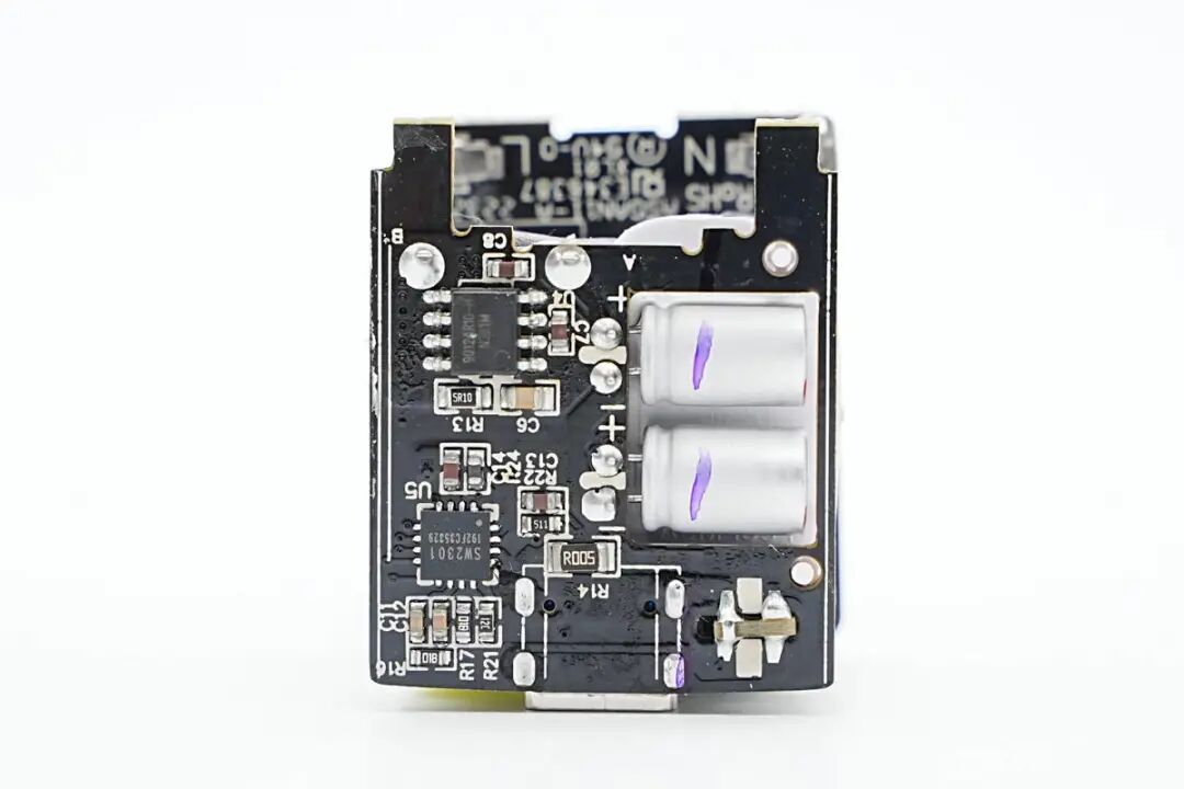 协议芯片采用智融SW2301协议芯片,支持市面上主流的快充协议,并支持外接热敏电阻检测温升,进一步提升充电器的安全性。充电器内部布局紧凑,用料扎实。