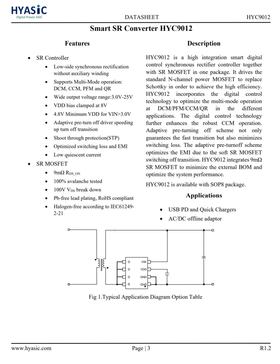 同步整流芯片来自华源智信,型号为HYC9012,是一颗内置同步整流管的同步整流芯片,支持DCM、CCM、PFM和QR多种工作模式,供电电压范围为3-25V,具有自适应预关闭驱动以加快关闭过渡,支持可选的最小关断时间,启动时驱动下拉,10nS关断延时等功能,具有低静态电流。
