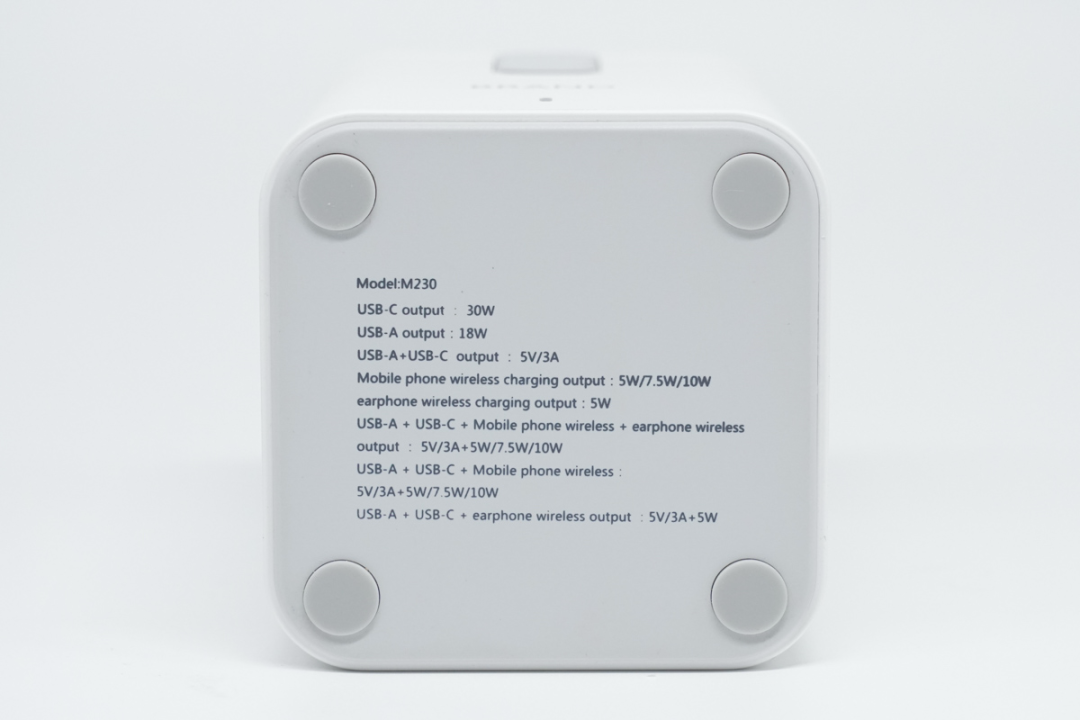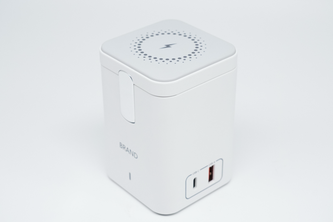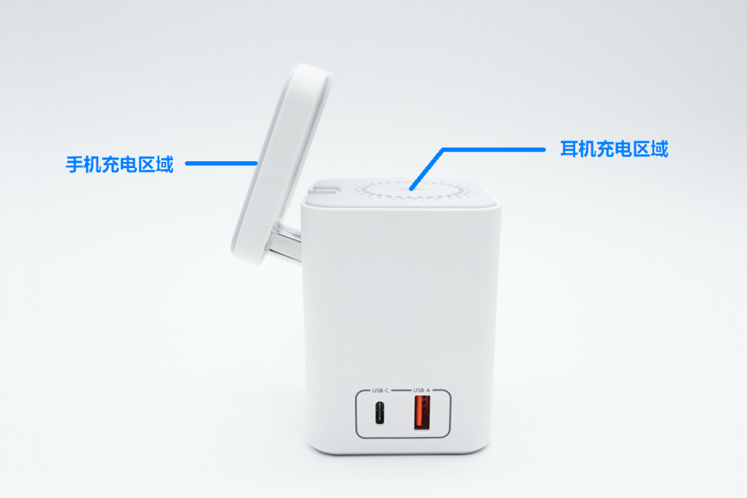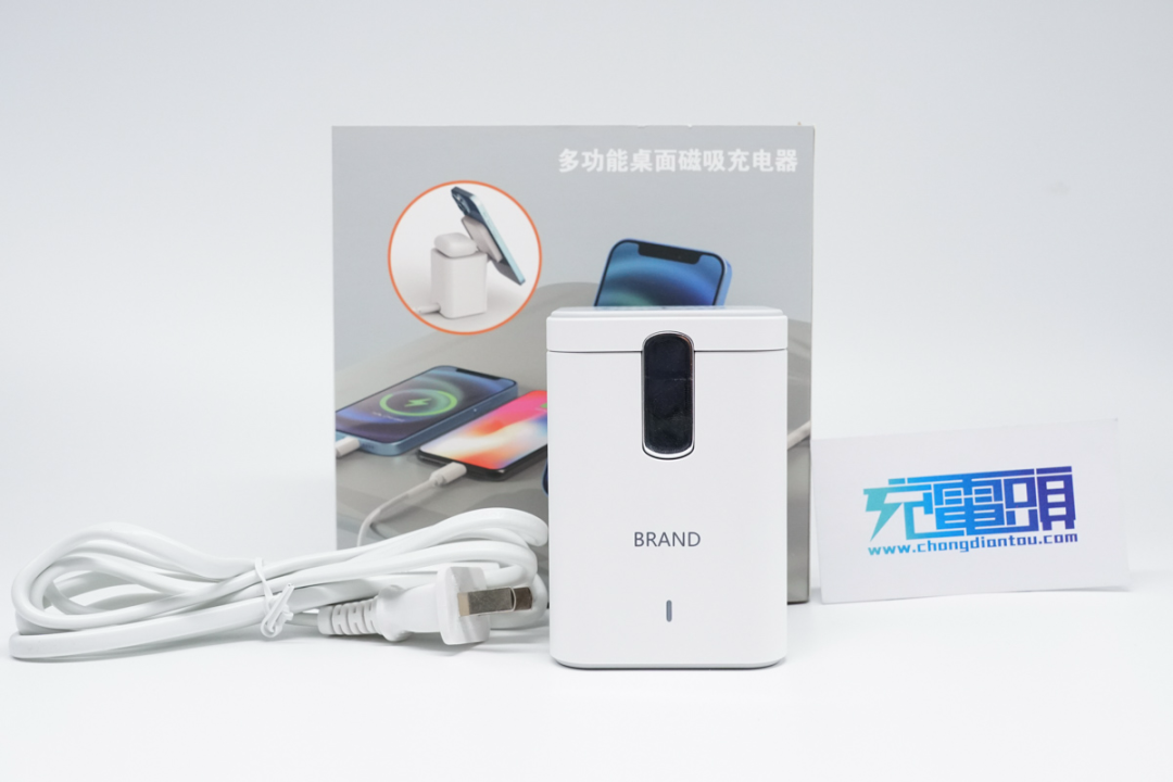 今翔多功能桌面磁吸充电器采用优雅的白色座式设计,设计风格看上去就像 3C 小家电一样,壳体正面是 BRAND 商标,还有一个银色活动支撑杆,带有无线充电、有线充电功能,支持全家多款数码产品一起充电。今翔多功能桌面磁吸充电器顶部是 10W 磁吸无线充电模块,支持 5W / 7.5W / 10W 三种发射功率,内部磁力部件与 iPhone 14、13、12 系列等配备 MagSafe 磁吸无线充电模块的设备相匹配。磁吸无线充电模块,采用活动式设计,通过支撑杆与本体连接,表面上就是一个整体,其实内有乾坤。顶部 10W 磁吸无线充电器可以倾斜拉起,这时候磁吸无线充电器面板就会倾斜面对人眼,方便用户边玩边充电,支持横屏、竖立摆放。本体上的第二个无线充电区域主要为耳机充电,功率为 5W,当然也可以为手机、智能穿戴等支持 Qi 标准的设备进行无线充电。除两个无线充电区域外,本体侧面还设置了速度更快的双口有线充电区域,1A1C 接口布局,其中 USB-C 支持 30W PD 快充输出,USB-A 支持 18W 快充输出,兼顾新老设备使用。输入电力方面,内置交直流转换器,与外部采用分体式线缆设计,接口为常见的 8 字线缆,连接家用墙插交流电即可使用。配套线缆为标准 8 字线,插头是国标两脚,很常见的线缆。今翔多功能桌面磁吸充电器底部带有四个防滑胶垫,并印有详细的铭牌参数。USB-A + USB-C + 手机无线充电:5V3A + 5W / 7.5W / 10WUSB-A + USB-C + 耳机无线充电 :5V3A + 5W使用 POWER-Z USB 测试仪 读取 USB-C 接口 PDO 报文,从反馈结果可以看到,支持 5V3A / 9V3A / 12V2.5A / 15V2A / 20V1.5A 五个固定电压输出档,另外还带有 3.3-11V3A / 3.3-16V2A 两组 PPS 电压子集。通过快充协议轮询发现,USB-C 接口支持 PD3.0、QC3.0、FCP、AFC、APPLE2.4A 等市面常见的快速充电协议。通过快充协议轮询发现,USB-A 接口支持 QC3.0、FCP、AFC、APPLE2.4A 等市面常见的快速充电协议。今翔多功能桌面磁吸充电器是一款桌面多功能充电座,其具备两个无线充电区域,支持 10W 手机磁吸无线充电、5W 耳机无线充电,两个有线充电接口,最高提供 30W PD 快充输出。它采用立式充电座的设计模式,其中磁吸无线充电模块还通过活动机构设计,可以平放与倾斜,兼顾多设备充电与收纳等用途。今翔多功能桌面磁吸充电器目前已接受 OEM/ODM 订单,详情请与今翔销售联系。同时为了满足不同市场需求,第二代多功能磁吸桌面充已在开发调试中,将支持 65W USB-C 有线输出,敬请关注。![]()