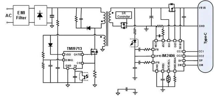 为应对PD快充充电器市场高速发展,拓尔微推出通用型AC-DC控制器TMI9713,可以直接适配市场目前 65W的PD快充充电器方案,参考TMI9713的典型应用图,搭配拓尔微协议芯片IM2406,助力充电器厂商设计出优秀的PD快充充电器。