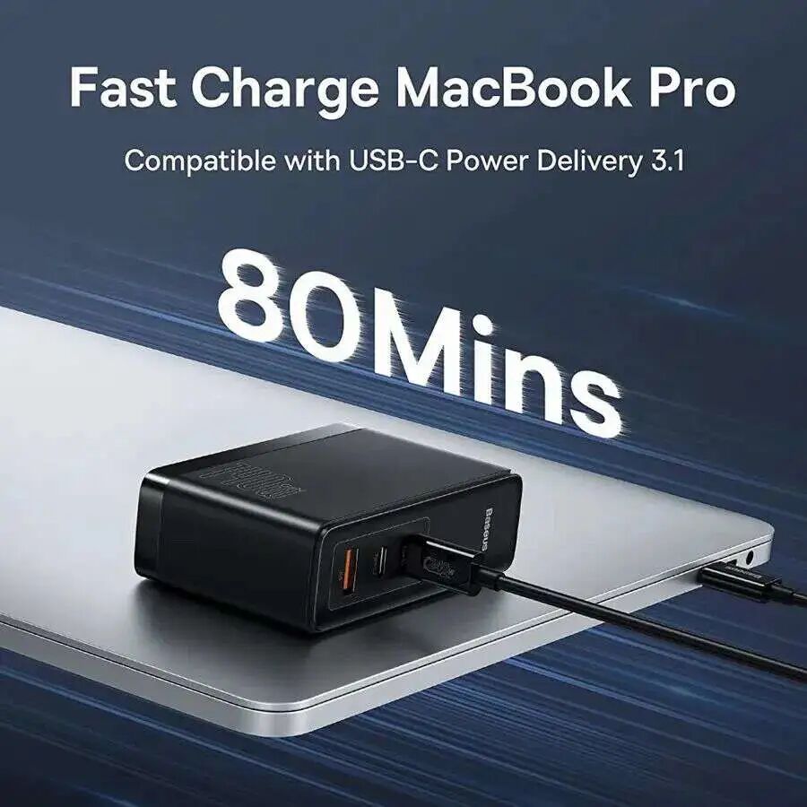 倍思 140W 氮化镓充电器采用倍思 GaN5 氮化镓方案制作,体积小巧便携,支持最新 PD3.1 快速充电新标准,具备 28V5A 大功率 PDO,并带有 2C1A 三个输出口,适配 MacBook Pro 2021 使用,并支持其它数码设备一起充电,解决苹果原厂充电器的不足。