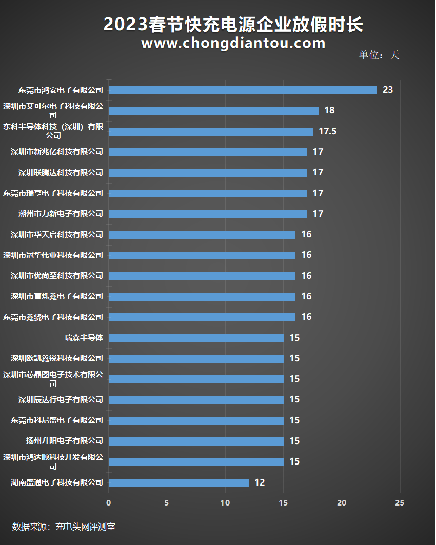 此次充电头网共汇集了20家消费类电源行业企业的春节放假安排,这些企业的春节假期时长主要集中在15-20天范围内。这个年假长度给予企业员工更多时间与家人团聚。同时错开了节假日的出行高峰。更长的假期让员工拥有了更多的选择。当前疫情防控已经放开,但每个人的自我防护仍然不能疏忽,充电头网也再次倡导各位读者朋友们,在回家过年的同时,也要做好防护。