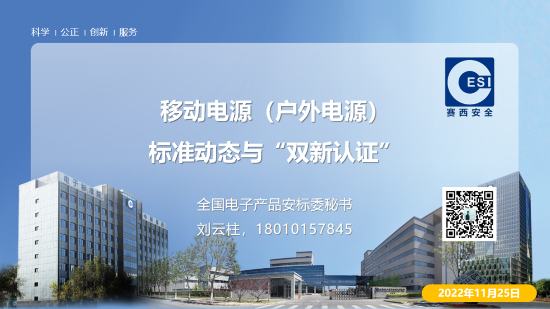 全国电子产品安全标准化技术委员会秘书/赛西实验室高级工程师刘云柱代表电子安标委作了《移动电源(户外电源)标准动态与“双新认证”》技术报告。