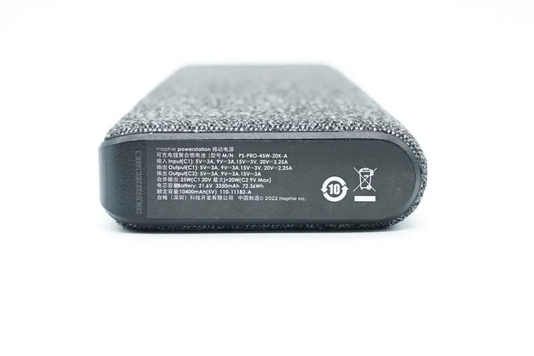 mophie 45W双C口充电宝侧面贴有规格参数贴纸;