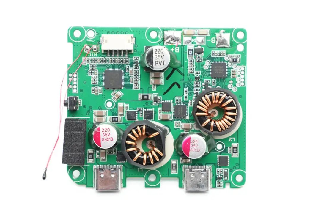 PCBA模块正面一览,焊接同步升降压芯片,降压芯片,两颗磁环电感,输出滤波电容,以及协议芯片等。