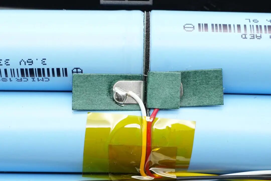 检测电池温度的热敏电阻也通过高温胶带固定。