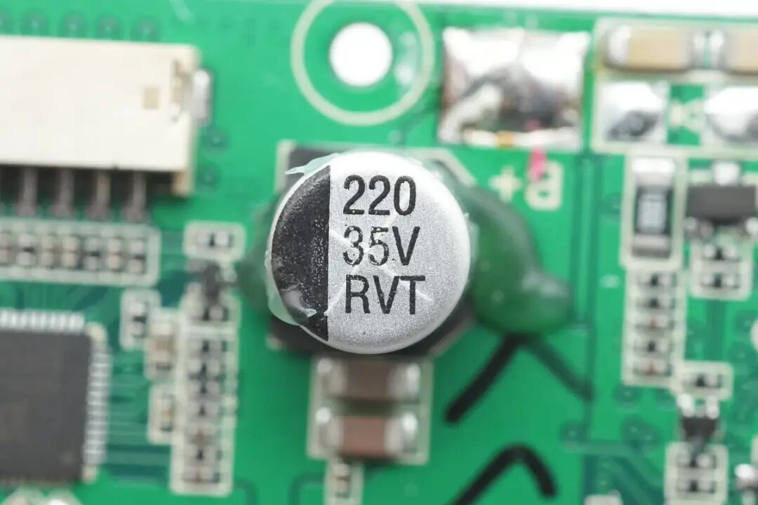 用于电池端的滤波电容特写,规格为220μF 35V。