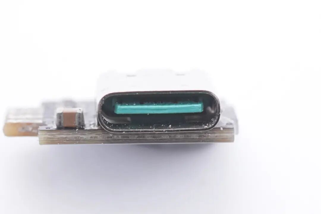 USB-C母座过孔焊接固定,绿色胶芯不露铜。