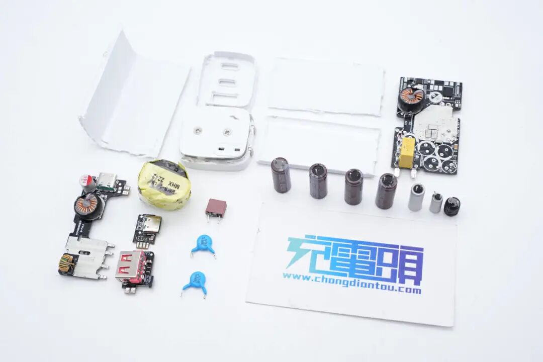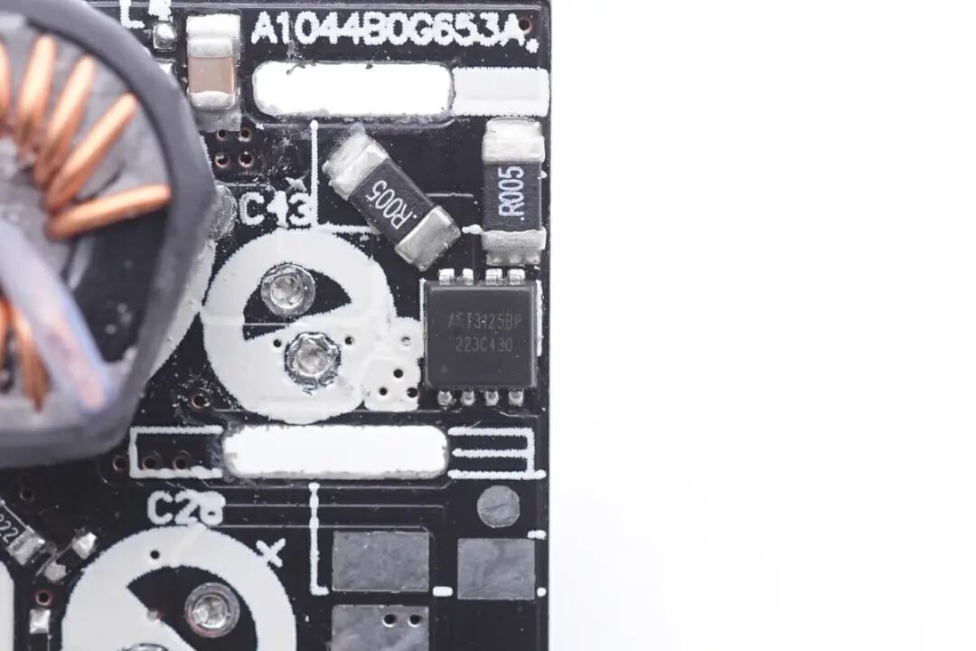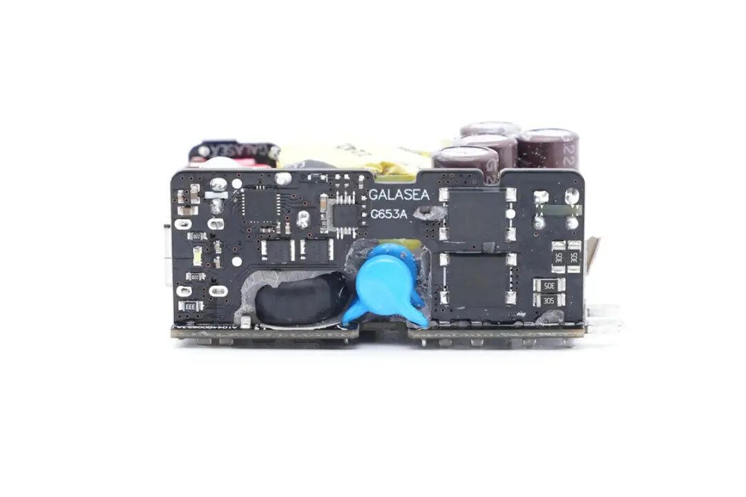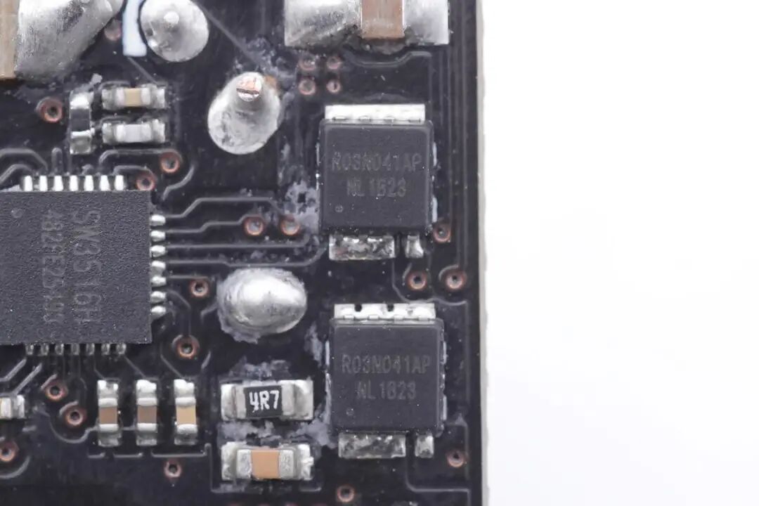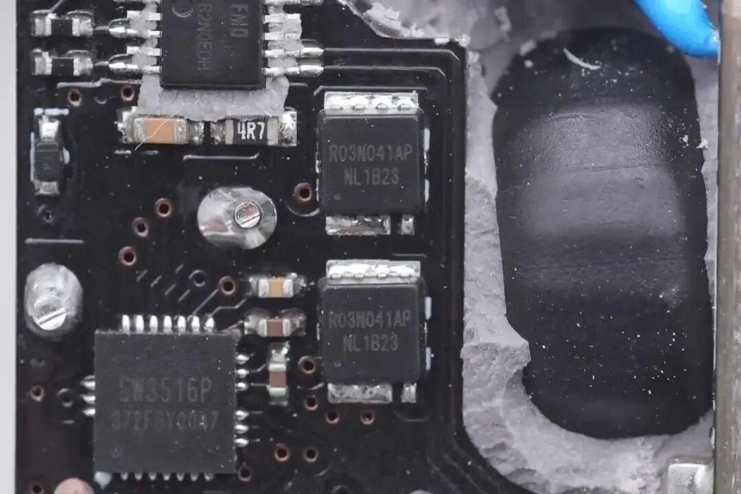 USB-C和USB-A接口采用两颗SW3516进行降压输出,搭配使用禾纳MOS管进行二次降压以及VBUS输出控制,采用辉芒微MCU进行功率自动分配。初级滤波电容来自永铭,输出滤波固态电容来自盛通,内部做工扎实,用料可靠。
