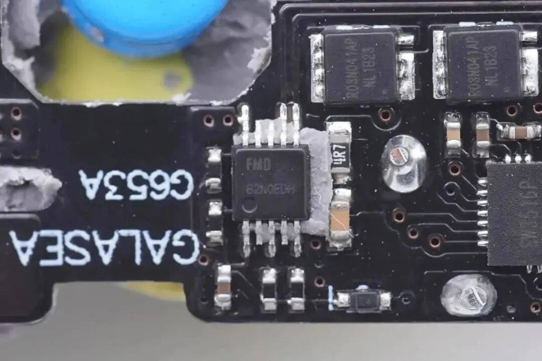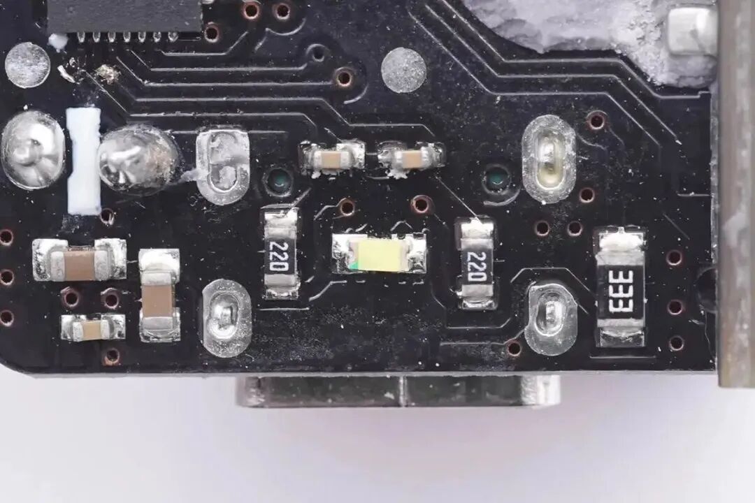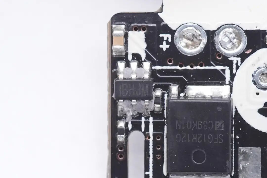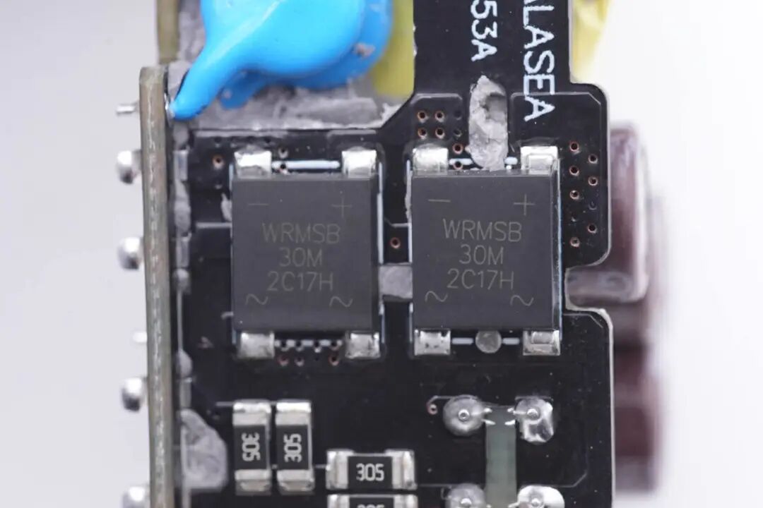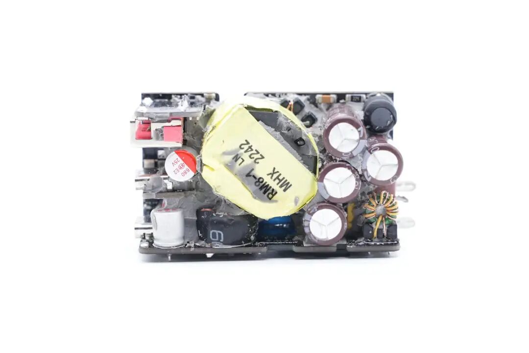 USB-C和USB-A接口采用两颗SW3516进行降压输出,搭配使用禾纳MOS管进行二次降压以及VBUS输出控制,采用辉芒微MCU进行功率自动分配。初级滤波电容来自永铭,输出滤波固态电容来自盛通,内部做工扎实,用料可靠。