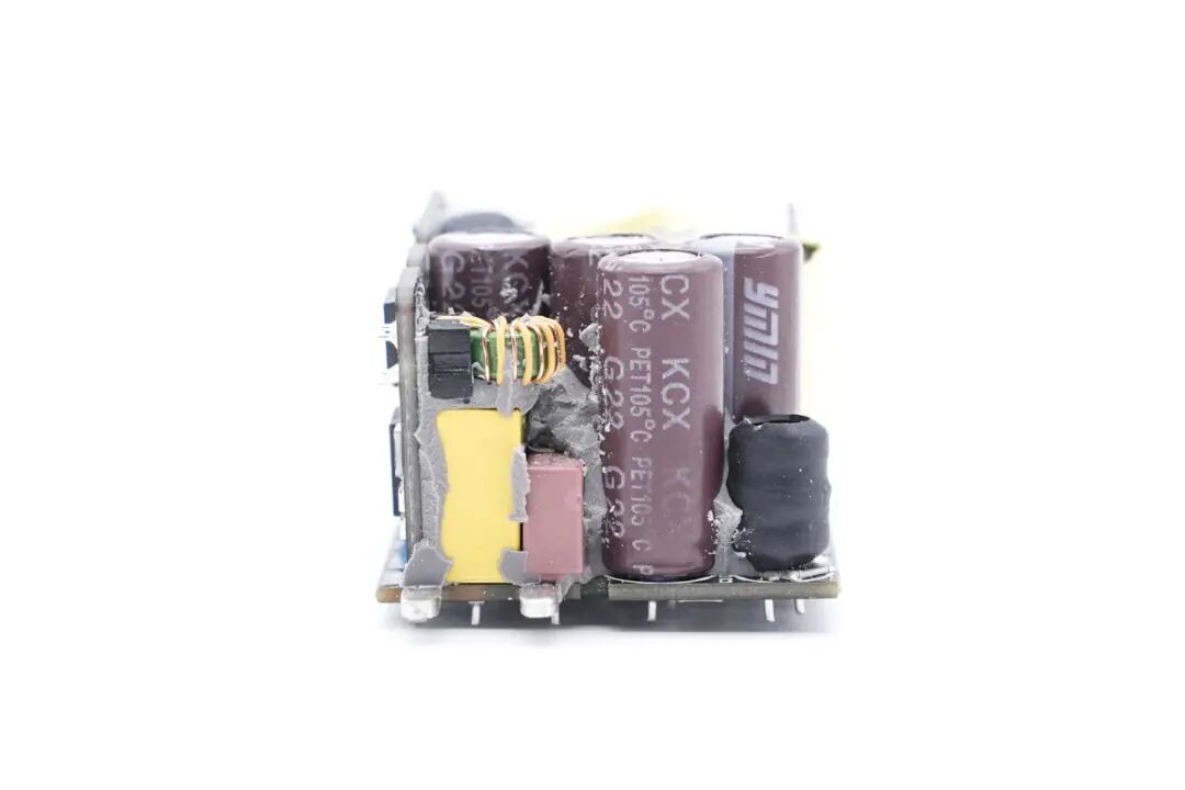 PCBA模块正面一览,侧面焊接一块小板连接初次级,其中右侧为输入端,焊接共模电感和高压滤波电容。变压器在中间位置,左侧为USB接口和输出滤波电容。