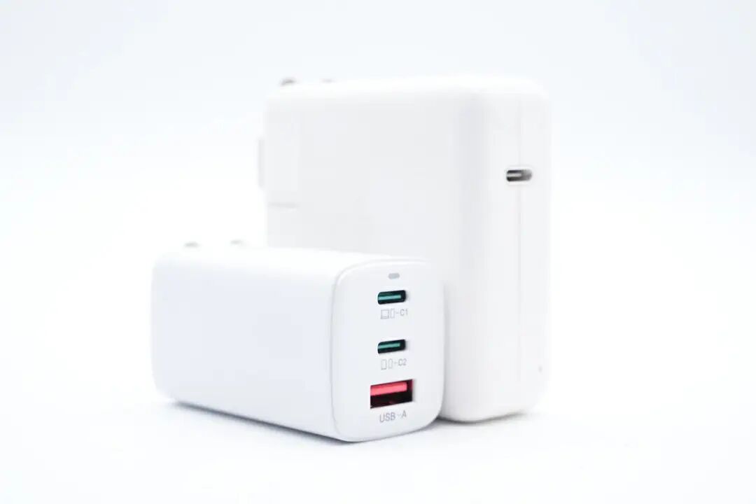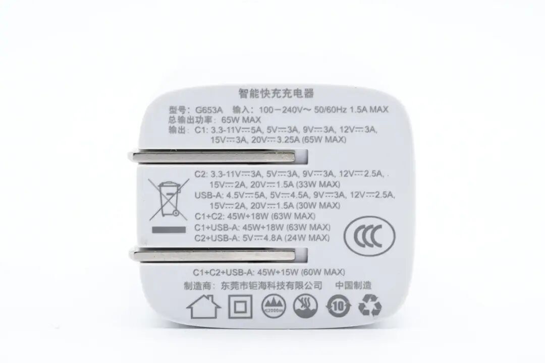65W多口充电器仍然是主流的出货品类,多个接口可以满足手机和笔记本电脑的同时充电需求,折叠插脚的使用,也使充电器更加便携,易于携带和收纳,方便又好用。深圳市钜海科技推出了一款65W氮化镓充电器,采用2C1A的接口配置,并且支持功率自动分配,非常实用。